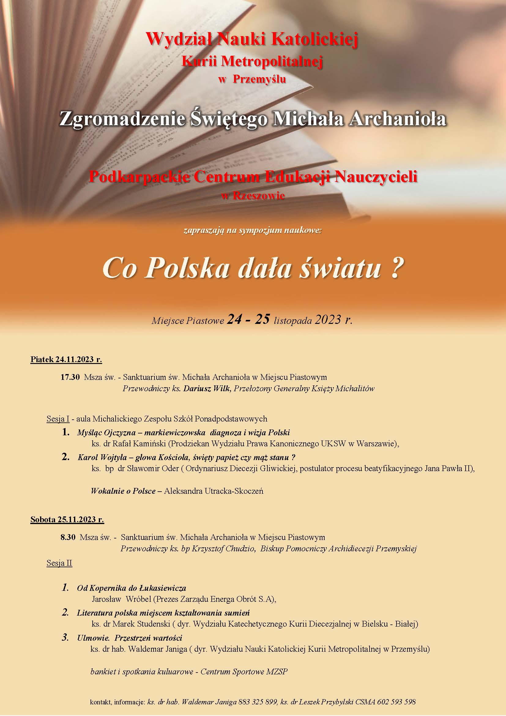 Kontakt, informacje: ks. dr hab. Waldemar Janiga 883 325 899, ks. dr Leszek Przybylski CSMA 602 593 598